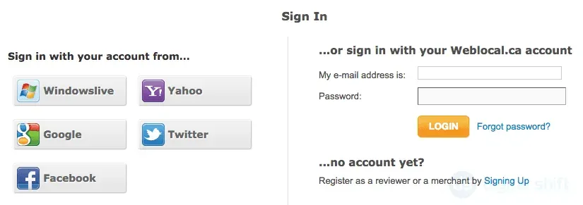 You will be prompted to either Sign in with an existing Social Profile, sign in with an existing Weblocal.ca account, or create a new login for Weblocal.ca. If you already have an existing account, please proceed to Step 3.