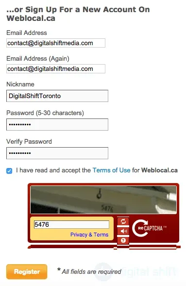 You will be prompted to either Register with an existing Social Profile, or by creating a new account on Weblocal.ca. Enter all applicable information, accept ‘Terms of Use’ statement, enter captcha, and click ‘Register.’