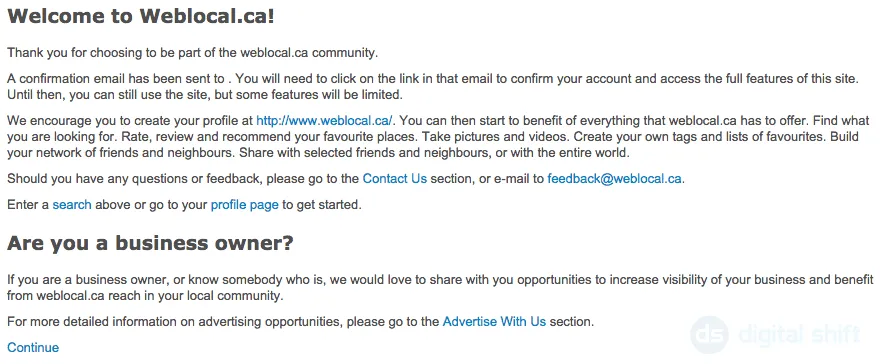 You will see a message welcoming you to Weblocal.ca. At the bottom of the message, you will see a button to ‘Continue’ with your directory listing.